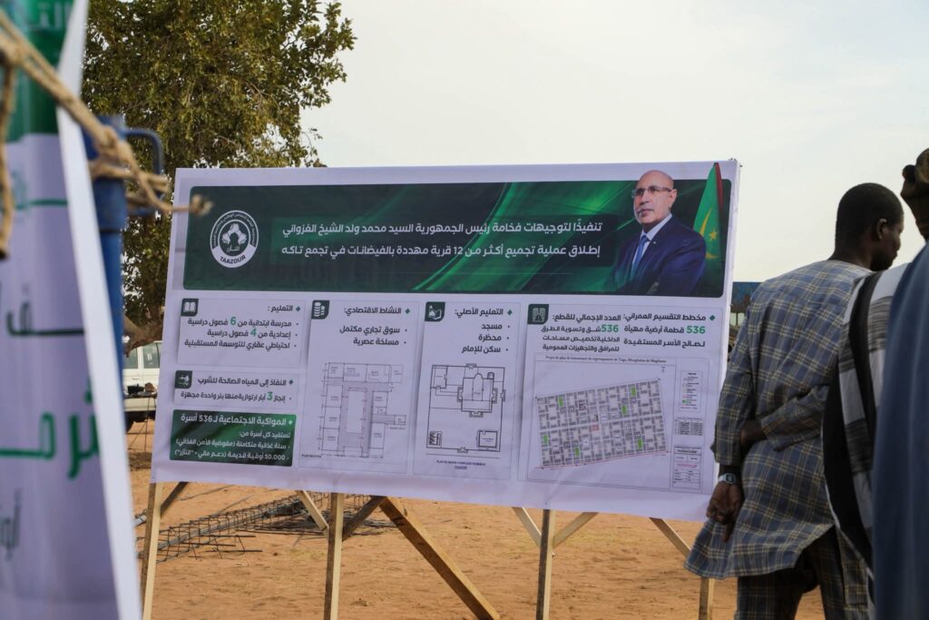 في إطار تنفيذ التوجيهات السامية لفخامة رئيس الجمهورية، السيد محمد ولد الشيخ الغزواني، الرامية إلى حماية المواطنين من مخاطر الفيضانات وتعزيز مقاربة تنموية قائمة على الكرامة والعدالة الاجتماعية، يواصل المندوب العام للتضامن الوطني ومكافحة الإقصاء “التآزر”، رفقة والي ولاية گورگول، السيد محمد المختار ولد عبدي، تنفيذ عملية تجميع أكثر من 12 قرية كانت مهددة بالفيضانات في تجمع تاگه الجديد بولاية كوركول.